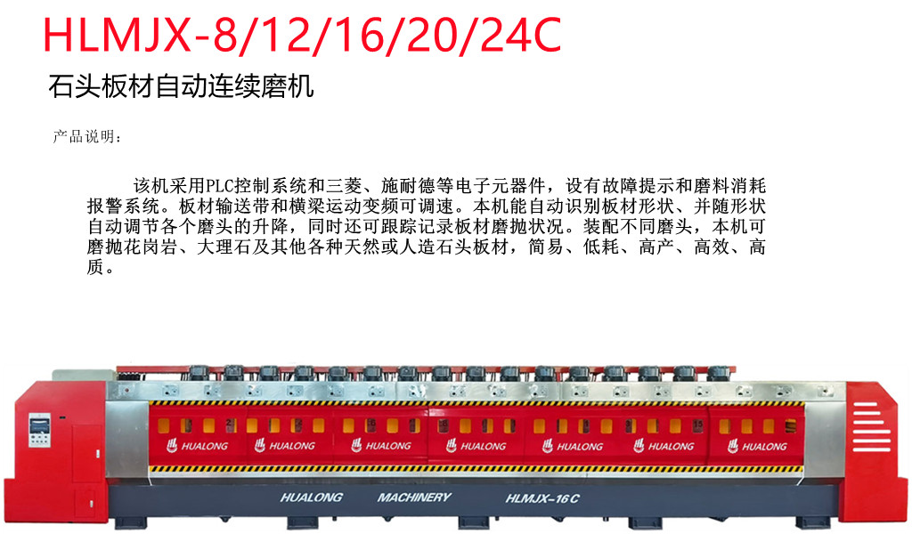 HLMJX-16 型自動石材(cái)板材連續(xù)拋光機,配備多個樹脂盤頭和 PLC 控製係統(tǒng),能夠連續自動地對板材進行研磨和拋光,是花崗岩等硬質石材表麵處理(lǐ)的理想選擇。安裝不(bú)同類型的頭,它也(yě)非(fēi)常適(shì)合大(dà)理石、石英岩和其他石材(cái)板(bǎn)材的加工。
