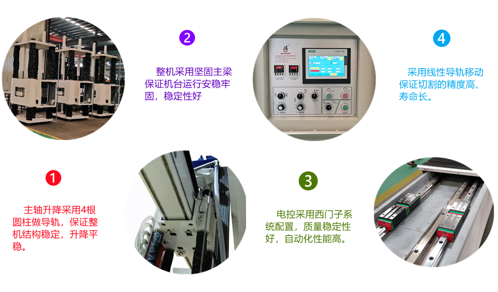 (2) Adopts 4 pillars for spindle sliding, which ensure the structure of the machine is steady and the lifting is stable.